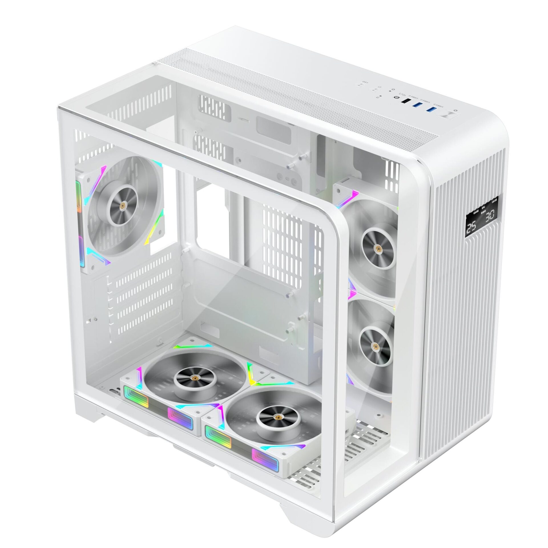 Панорамний вигляд: Загартоване скло з трьох сторін RT5 оснащений трьома панелями із загартованого скла, що забезпечують панорамний вигляд на ваше складання. Підкресліть своє найкраще у своєму класі обладнання та яскраве RGB-підсвічування з різних кутів, ідеально підходить для любителів кіберспорту та ігор, які люблять сліпучі налаштування. Унікальний дизайн, якісні матеріали U-подібна конструкція із загартованого скла спереду та зверху, що підкреслює бездоганну естетику вашого складання. Вишуканий зовнішній вигляд у поєднанні з обладнанням та підсвічуванням ARGB забезпечує вражаючий візуальний ефект! Розкрийте свій ігровий потенціал із нашим передовим корпусом для ПК! Завдяки витонченому футуристичному багатофункціональному дисплею на передній металевій панелі ви отримаєте доступ в режимі реального часу до життєво важливих показників вашої установки. Контролюйте завантаження ЦП, використання пам’яті, температуру та частоту одним поглядом.
