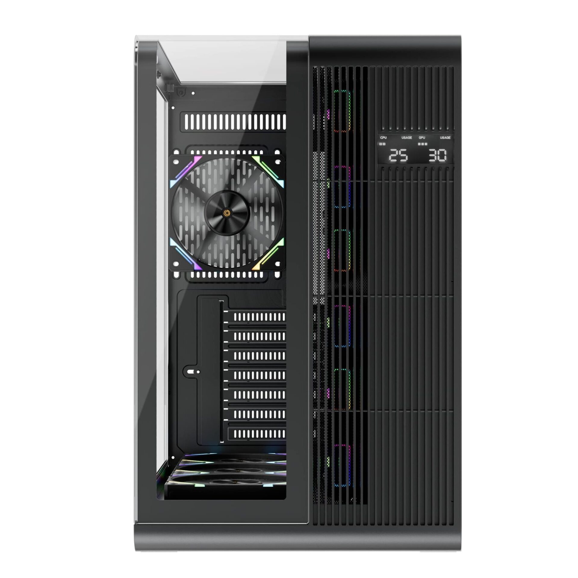 Панорамний огляд збірки RT7 оснащений трьома панелями із загартованого скла – спереду, зверху та збоку. Такий дизайн відкриває повний панорамний вид на вашу систему та підкреслює сучасне обладнання з будь-якого ракурсу. Унікальний дизайн та преміальні матеріали U-подібна конструкція зі скла надає корпусу цілісного, елегантного вигляду, підкреслюючи естетику вашої конфігурації. Ігровий потенціал під контролем На передній металевій панелі розташований стильний функціональний дисплей. В реальному часі він відображає температуру процесора, завантаження та частоту, а також використання пам’яті. Слідкуйте за ключовими параметрами системи, не відволікаючись від ігрового процесу.