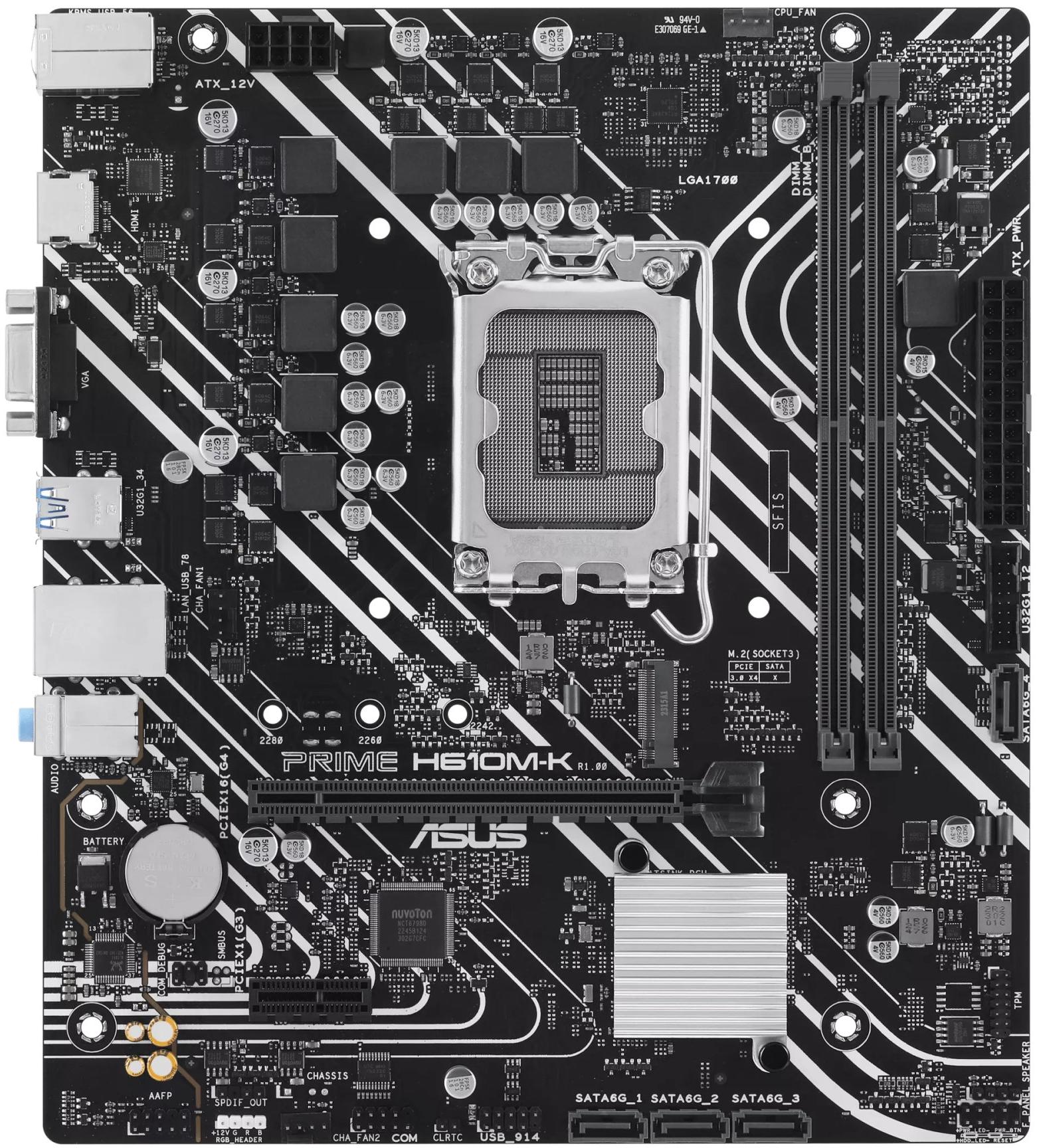 Asus PRIME H610M-K — материнська плата з чипсетом Intel H610. Завдяки надійній системі живлення, комплексним рішенням для охолодження та інтелектуальним параметрам налаштування надає користувачам і розробникам персональних комп’ютерів низку варіантів налаштування продуктивності за допомогою інтуїтивно зрозумілих функцій програмного забезпечення та мікропрограми. Виконана у формфакторі Micro ATX, а тому оптимізована для компактних систем. Передбачає встановлення процесорів Intel Core 12-го та 13-го покоління. Містить гнучкі інструменти для налаштування кожного аспекту вашої системи, щоб ідеально відповідати вашому способу роботи та максимально підвищити продуктивність. Серія Prime H610 оснащена комплексними засобами керування охолодженням, які можна налаштувати за допомогою програмного забезпечення Fan Xpert 2+ або через UEFI BIOS. Всебічний захист системи гарантує фірмове рішення 5X Protection III. Для підключення периферійних пристроїв та накопичувачів має широкий набір інтерфейсів: M.2, Realtek 1Gb Ethernet, USB 3.2, USB 2.0, HDMI, VGA.