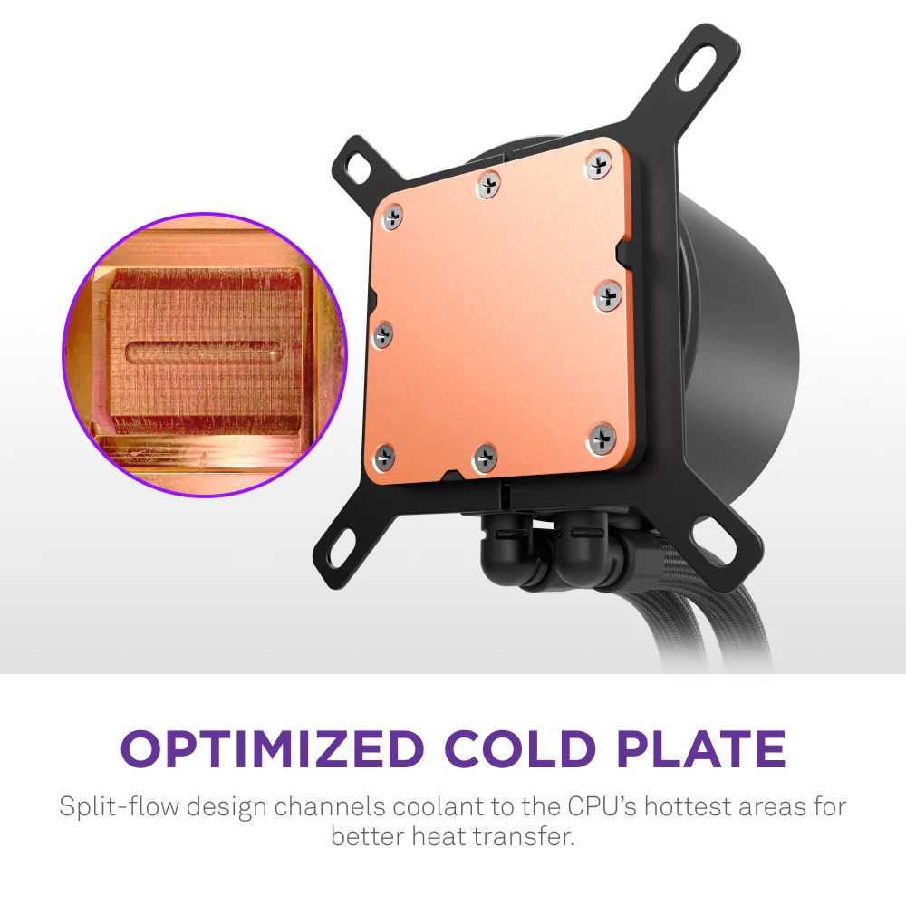 Система водяного охолодження NZXT Kraken Plus 360 V2 – оснащена спеціально розробленим насосом NZXT Turbine, РК-дисплеєм і вентиляторами для налаштування охолодження. Розумне охолодження. Яскравий дисплей Kraken Plus забезпечує потужне охолодження процесора, повністю настроюваний РК-дисплей і просту установку — розроблений для користувачів, які хочуть отримати як високу продуктивність, так і можливість персоналізації. На базі Turbine Насос NZXT Turbine розроблений для високої пропускної здатності та тиску, забезпечуючи ефективне охолодження з низьким рівнем шуму, яке відповідає високим навантаженням. Персоналізація на дисплеї Відображайте температуру в режимі реального часу, власні зображення, GIF-файли та веб-інтеграції, такі як Spotify та YouTube — все це на яскравому 1.54-дюймовому квадратному РК-дисплеї, який повністю контролюється за допомогою NZXT CAM. Оптимізоване кабельне з’єднання Вбудоване управління вентилятором у кришці насоса та один розгалужувальний кабель допомагають зменшити безлад і пришвидшити встановлення. Широка сумісність Кронштейни для кріплення без інструментів підтримують найновіші сокети процесорів Intel та AMD. Готовий до встановлення Попередньо нанесена термопаста для швидшого налаштування та ефективного відведення тепла. Оптимізована холодна пластина Конструкція з розділеним потоком направляє охолоджуючу рідину до найгарячіших ділянок для ефективного охолодження.