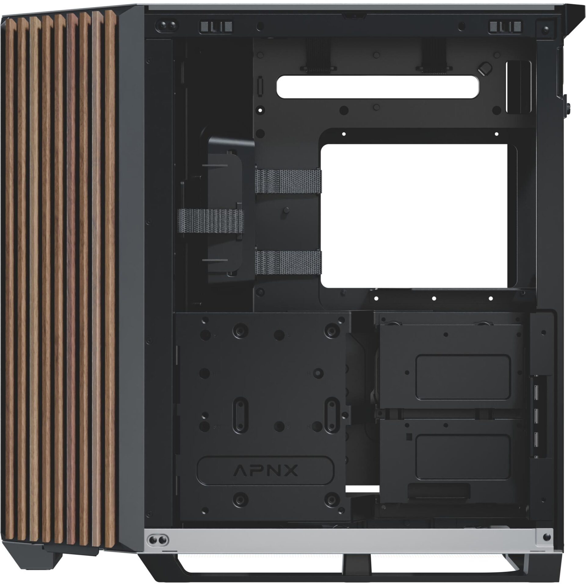 Корпус APNX V1 поєднує в собі точність охолодження, що налаштовується, та унікальну конструкцію повітрозабірника з кутом нахилу 45°, розміщену в гладкій панорамній двокамерній конструкції. Створена для продуктивності та зручності користувача, конструкція механізму пропонує оптимізовані варіанти охолодження для графічного та центрального процесорів, зі швидкознімними охолоджувальними кронштейнами та панелями для легкого доступу, а також акуратну та охайну прокладку кабелів. Завдяки панорамному загартованому склу V1 є ідеальним корпусом для геймерів, творців контенту та збирачів ПК, які шукають продуктивність з індивідуальним дизайном. Унікальна теплова конструкція Інноваційна конструкція двокамерного панорамного корпусу з кутовим всмоктуванням повітря під кутом 45° покращує загальний потік повітря та теплову ефективність як для графічного, так і для центрального процесора, зберігаючи при цьому фірмовий вигляд із повністю загартованого скла. Кутова впускна панель підтримує три 12-сантиметрові, два 14-сантиметрові та до двох 16-сантиметрових вентилятори. Форма відповідає функції Верхня вентиляційна сітка візуалізує унікальний шлях повітряного потоку всередині, інтуїтивно зрозуміло демонструючи динаміку охолодження кутового входу та покращуючи верхній потік повітря. Механізм регулювання положення материнської плати V1 пропонує два положення для встановлення материнської плати, щоб забезпечити більше місця для покращення повітряного потоку та продуктивності охолодження графічного процесора або для зручного встановлення товстіших радіаторів/вентиляторів для пріоритетного охолодження центрального процесора. Контролюйте своє охолодження Насолоджуйтеся широким спектром потенційних конфігурацій охолодження завдяки десяти слотам для вентиляторів, а також підтримці рідинного охолодження до 360 мм і процесорних кулерів до 170 мм. Виразник стилю Доступний у чорному, білому та чорно-білому кольорах, V1 також має нашу першу в історії панель з дерев’яним акцентом, виготовлену з масиву горіха або ясена із захисним покриттям. Виберіть вигляд, який доповнює ваш стиль. Конструктивна підтримка графічного процесора Кріплення для графічного процесора з регульованою висотою та кутом нахилу входить до комплекту, тому ваша важка відеокарта (до 395 мм завдовжки) буде в надійних руках. Акуратна та охайна система прокладання кабелів V1 розроблений для інтуїтивно зрозумілого управління кабелями. Прозорі кабельні канали зі стяжками на липучках та гумовими доріжками на бічній панелі забезпечать ідеальний зовнішній вигляд вашої збірки.